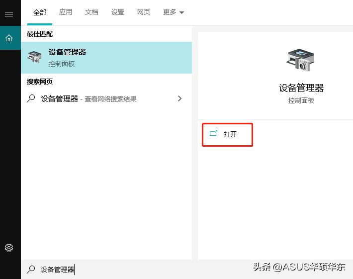 01、在搜索框里输入【设备管理器】,在出现的搜索结果中选择“打开”