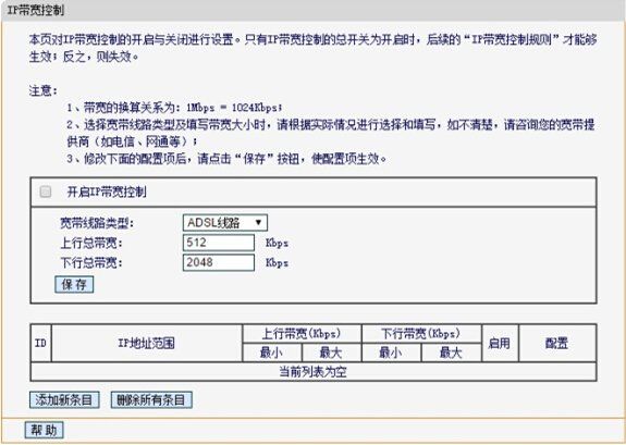 7、再单击左侧的“IP带宽控制”链接,在右边勾选上“开启IP带宽控制”复选框并在下面选择正确的网速。