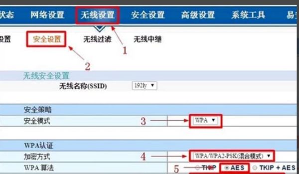 9、无线网络密码设置:点击“无线设置”——>“安全设置”——>“安全模式”选择:WPA——>“加密方式”选择:WPA/WPA2-PSK(混合模式)——>“WPA算法”选择:AES——>设置“密码”——>点击“保存”。