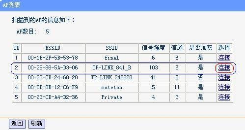 在扫描到的信号列表中选择B路由器SSID号,如下图中TP-LINK_841_B,点击“连接”。