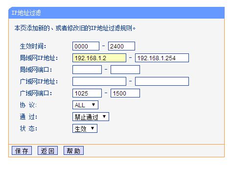 5、按下图设置表示局域网所有ip,任何端口,对任何广域网地址,1025-1500端口的访问都会被阻止,点击保存即可。
