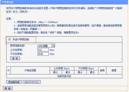 7、再单击左侧的“IP带宽控制”链接,在右边勾选上“开启IP带宽控制”复选框并在下面选择正确的网速。