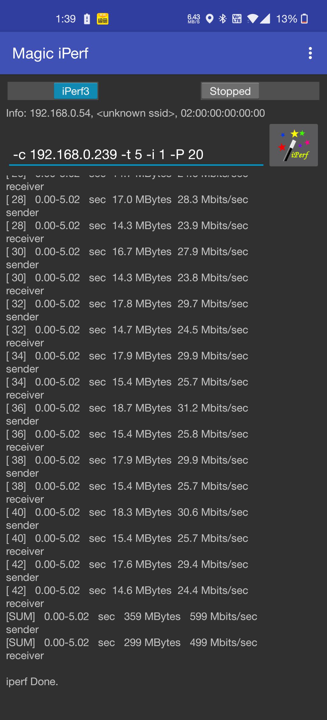 在无线mesh组网下,节点虽然间隔一面实体墙,但节点间的连接稳定性的和速度表现不错,通过iperf3测试子节点的和主节点间的吞吐量,传输速度接近600Mb/S。在隔墙的mesh无线组网中3频的MX4200表现出色 ,上文介绍过的双频mesh在隔墙无线组网中,子母节点的实际吞吐速度一般都只能在300Mb/S左右。