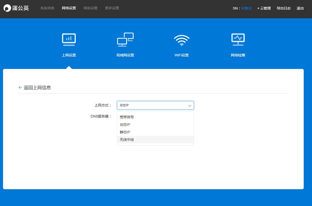 路由器的本地化设置相当简单,通电之后主动连接其自带的WiFi,然后打开IE输入“10.168.1.1”管理登陆的地址,最先跳出的窗口便是设置上网方式,可在宽带拨号、动态IP、静态IP、无线中继中选择。