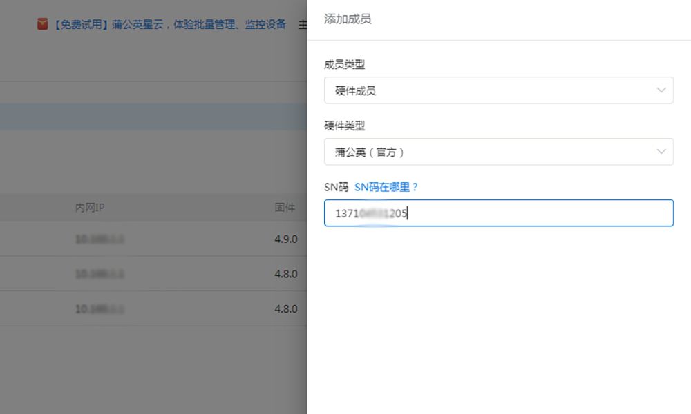 组网第一步,登陆Oray总台账号,点开[成员管理]->[添加成员],在对话框中输入蒲公英X3A的SN码,以硬件成员的类型加入总台账号之下。