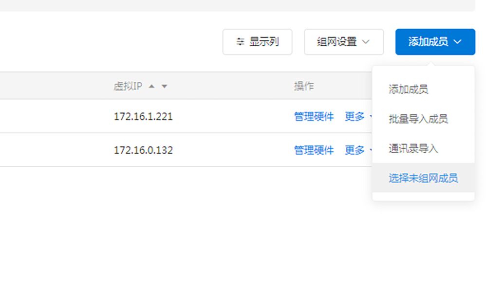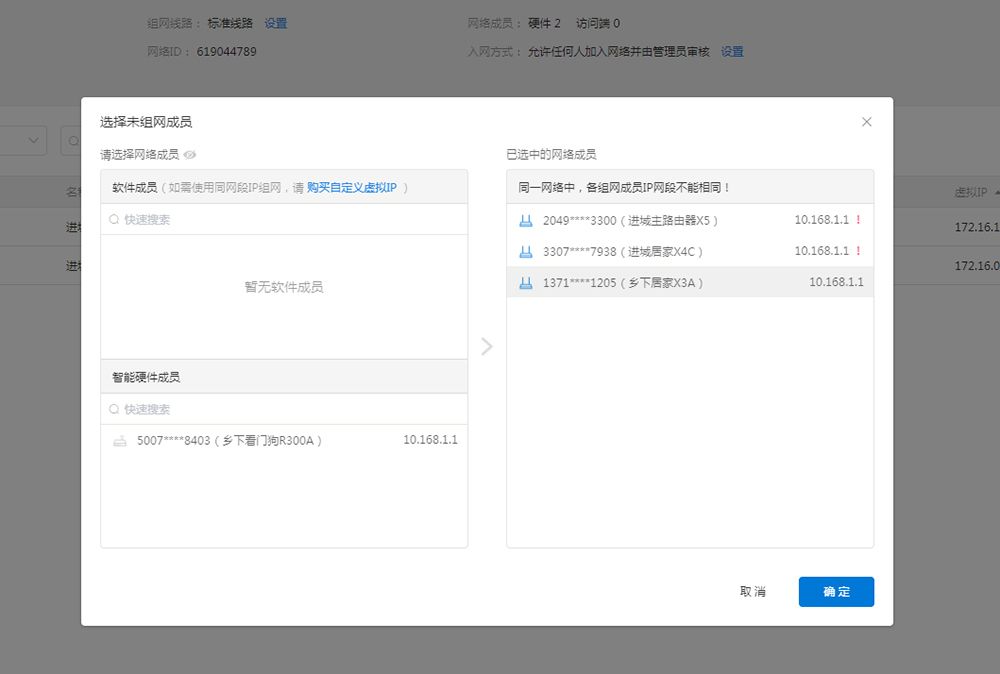 第二步,把想要组网的成员添加到右侧,标准版可以免费加3个成员,如果不想花钱,就用认谁的时候把谁添加上就行,这个成员管理在电脑上和手机APP上都可以实现。