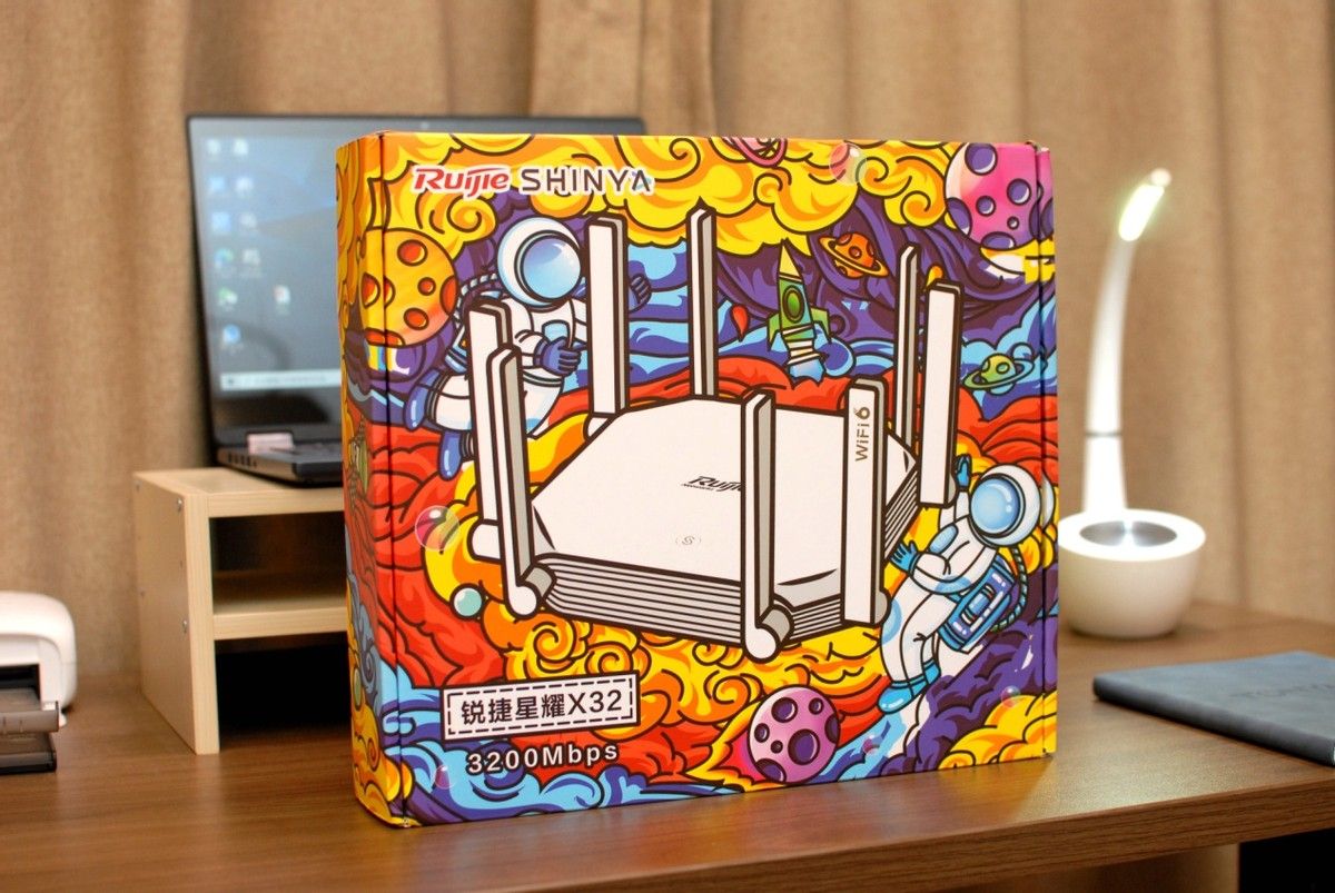 为什么说这款路由器适合新青年呢?看包装想必你就明白了,漂亮的涂鸦礼盒看起来就非常的潮,而且搭载了八根天线的路由器,看起来不仅外观霸气,信号方面相信也很给力,对了,细心的朋友不难发现,锐捷星耀X32千兆路由器除了支持Wi-Fi6之外,还支持3200Mbps无线速率,要知道这可比普通的千兆路由器快了一倍。