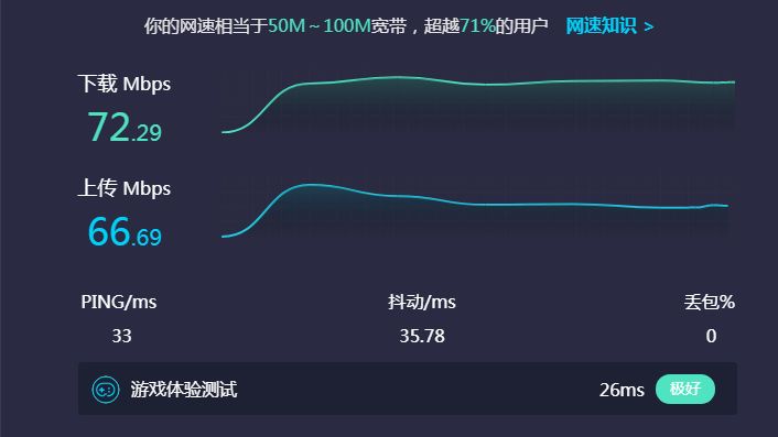 坐标广西三线城市,电信100M的宽带,通过测速网所得数据,下载为72.29Mbps,上传为66.69Mpbs,虽然没跑满,但也达到理想要求。