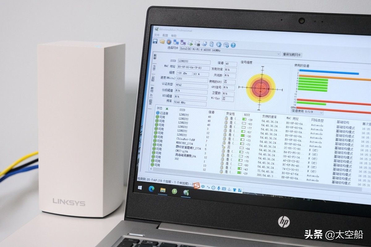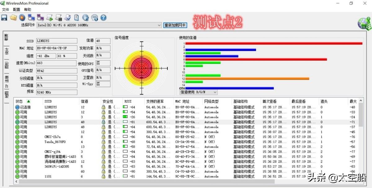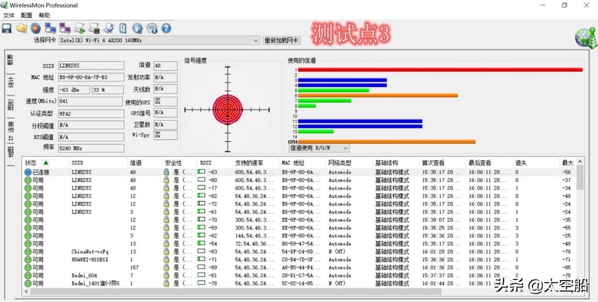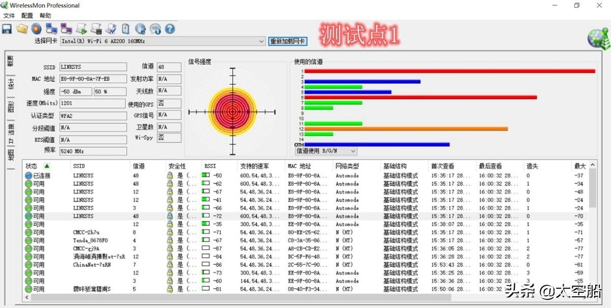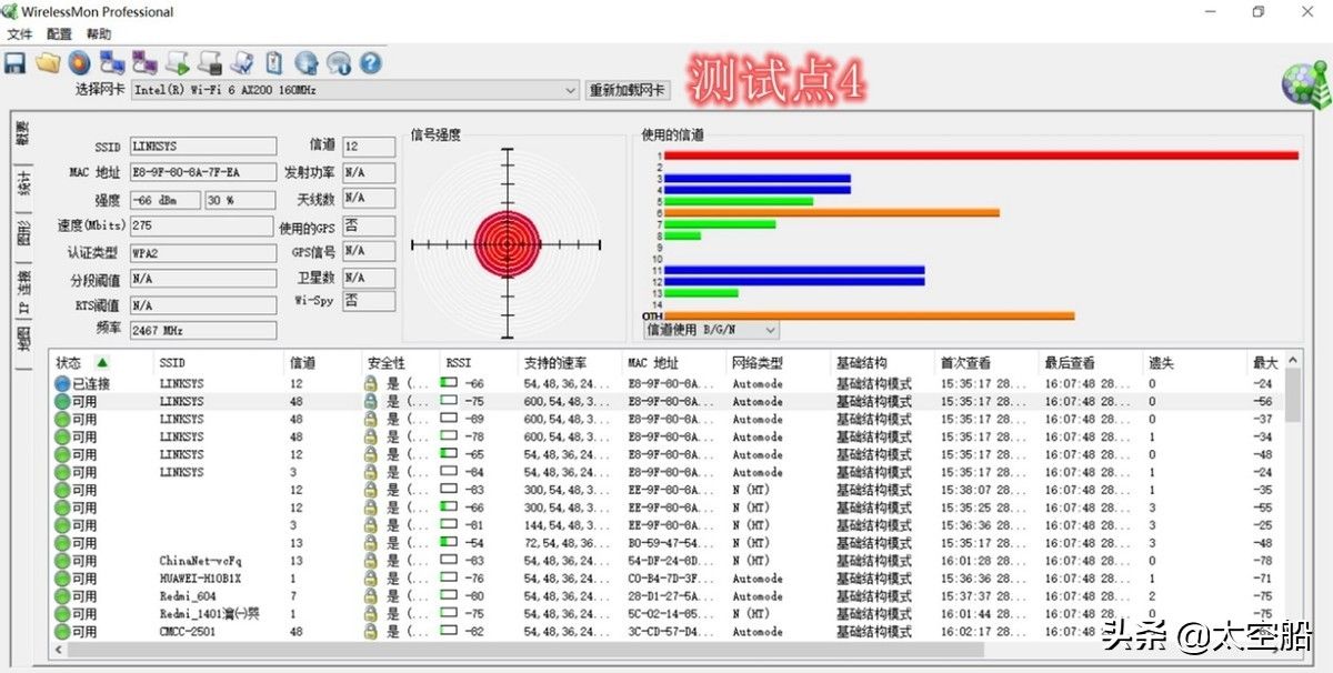 接下来换成WirelessMon测试软件,从搜索到的周边所有的无线路由器、无线AP或无线基站发出的信号强度、信道等实时信息来看,路由器在测试点1、2、3接入的都是5G频段,而测试点4则是2.4G频段,其中测试点3、4因为有墙体或玻璃隔开,所以信号强度有所减弱,其中测试点1达到了最高的1201Mbits ,测试点4则降到了275Mbits,局域网的传输速度还是比较能令人满意的。