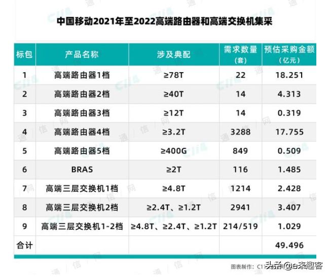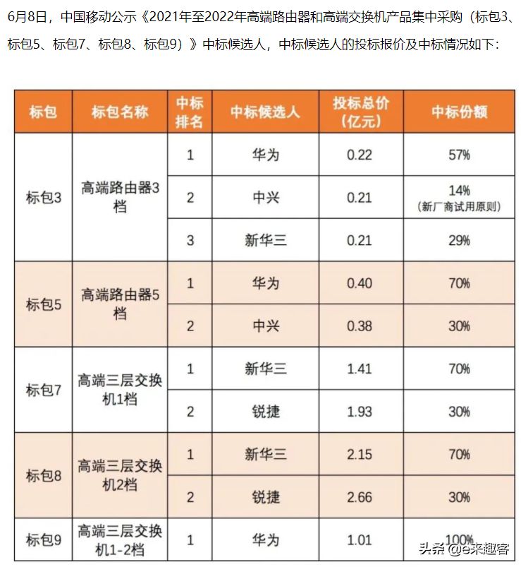 6月8日,中国移动公示《2021年至2022年高端路由器和高端交换机产品集中采购(标包3、标包5、标包7、标包8、标包9)》中标候选人,所有的中标厂商都为国内品牌,诺基亚、爱立信、思科都没获得份额。
