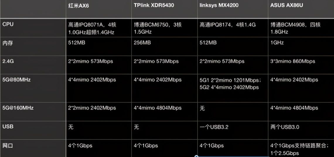 千元价位的路由器的CPU一般都是4核A53架构1.4GHz以上的配置,内存也都在512M-1G之间,这会提供更好的nat性能,更大的带机量和更快的USB接口磁盘性能。红米AX6虽然也是1.4GHz的4核处理器但其实是超频而来,具体规格和高端的8174并不完全相同。