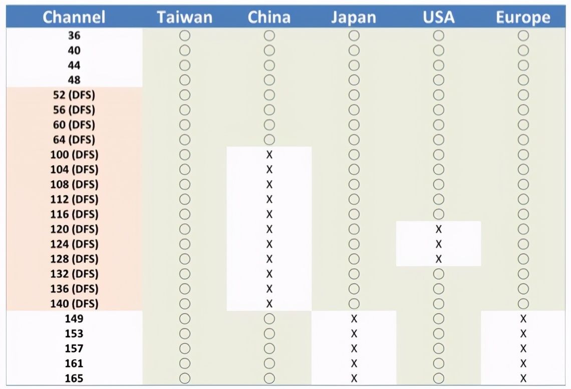 但是这里需要注意的是5G@160MHz所支持的信道非常少,160MHz需要8个相连的信道,例如36-64为一组,100-128为一组,这些不少信道是DFS信道。