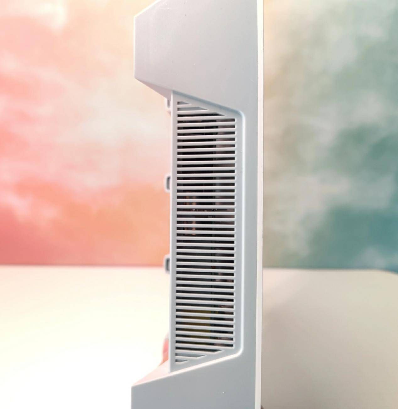 整个路由器外观非常的特别,整机前面凸起。侧边采用几何形切割,外观非常的美丽,中间有一个指示灯。以前路由器闪光灯特别多,一直在那里闪,现在化繁为简,在中心只一个闪光。红色代表网络异常,绿色代表网络正常。