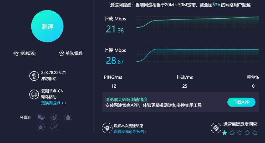 下载速度21M,上传也达到了28M左右,这个速度已经达到了60兆宽带了,测试结果还是挺不错的。