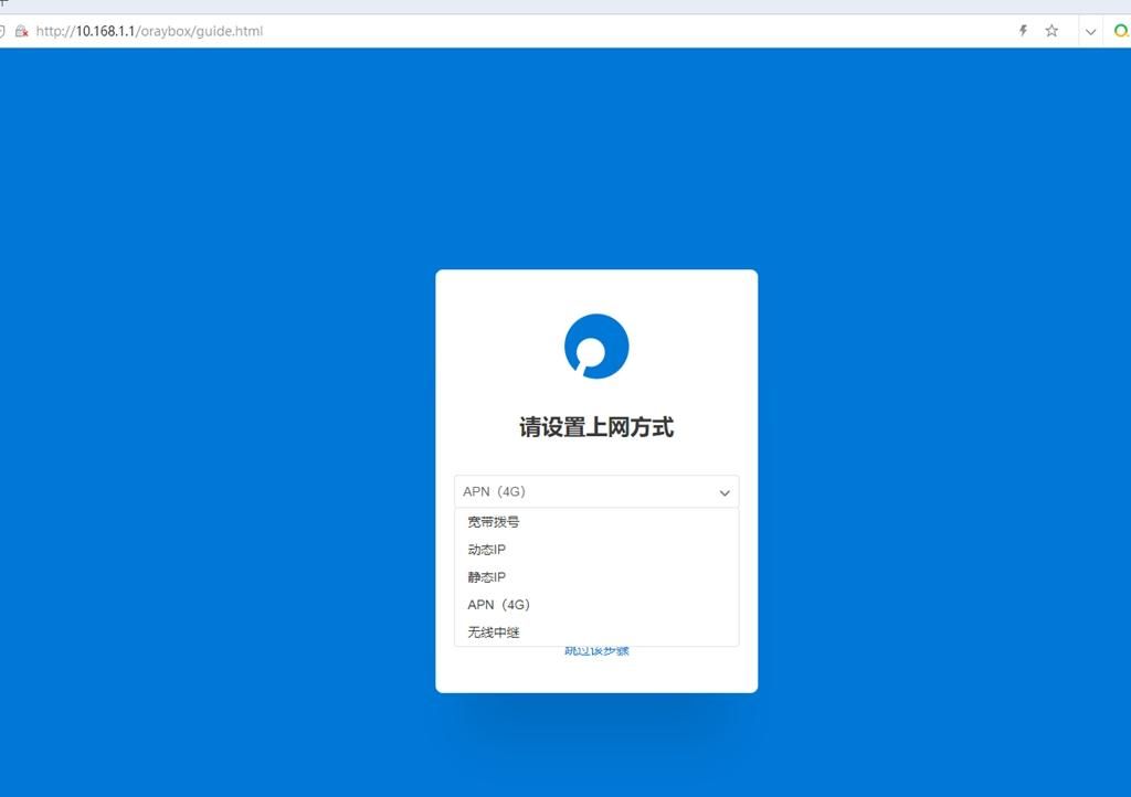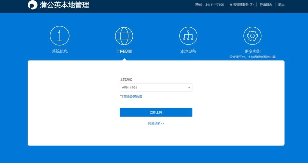 在配置界面可以根据自己的使用场景选择对应的上网方式 ,蒲公英X4C路由器宽带拨号、动态IP、静态IP、APN(4G)、无线中继五种模式选择,和传统路由器上,蒲公英X4C路由器新增了一个APN(4G)上网方式,选择这个模式,直接把4G物联卡插入就可以直接使用。