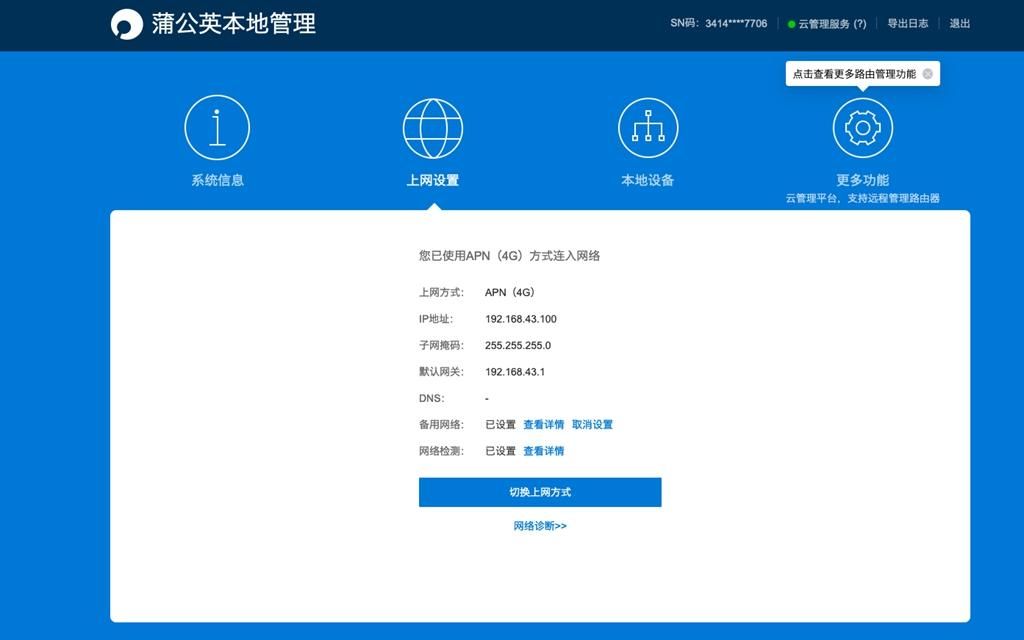 各种网络功能,进入后台就可以清晰看见:网络行为管理、上网权限、WiFi密码管理等等,都可以在后台操作。相较于传统路由器,它还有智能组网功能,这也是这款路由器的亮点之一。蒲公英SD-WAN智能组网采用自主研发的云虚拟组网技术,无需公网IP和复杂操作,以简单方式快速组建异地虚拟局域网,可以实现局域网内电脑、手机、服务器等信息数据的互联互通。