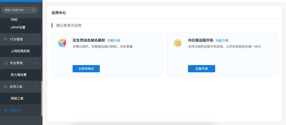 在后台还设置了应用中心,里面包含了贝锐家的常用应用,比如生壳动态域名解析,这功能一般玩NAS设备的玩家都相对熟悉一些,通过相应设置,可以通过域名访问自家的设备,第二个就是向日葵远程开机功能,通过绑定支持的设备可以实现远程开机的需求。