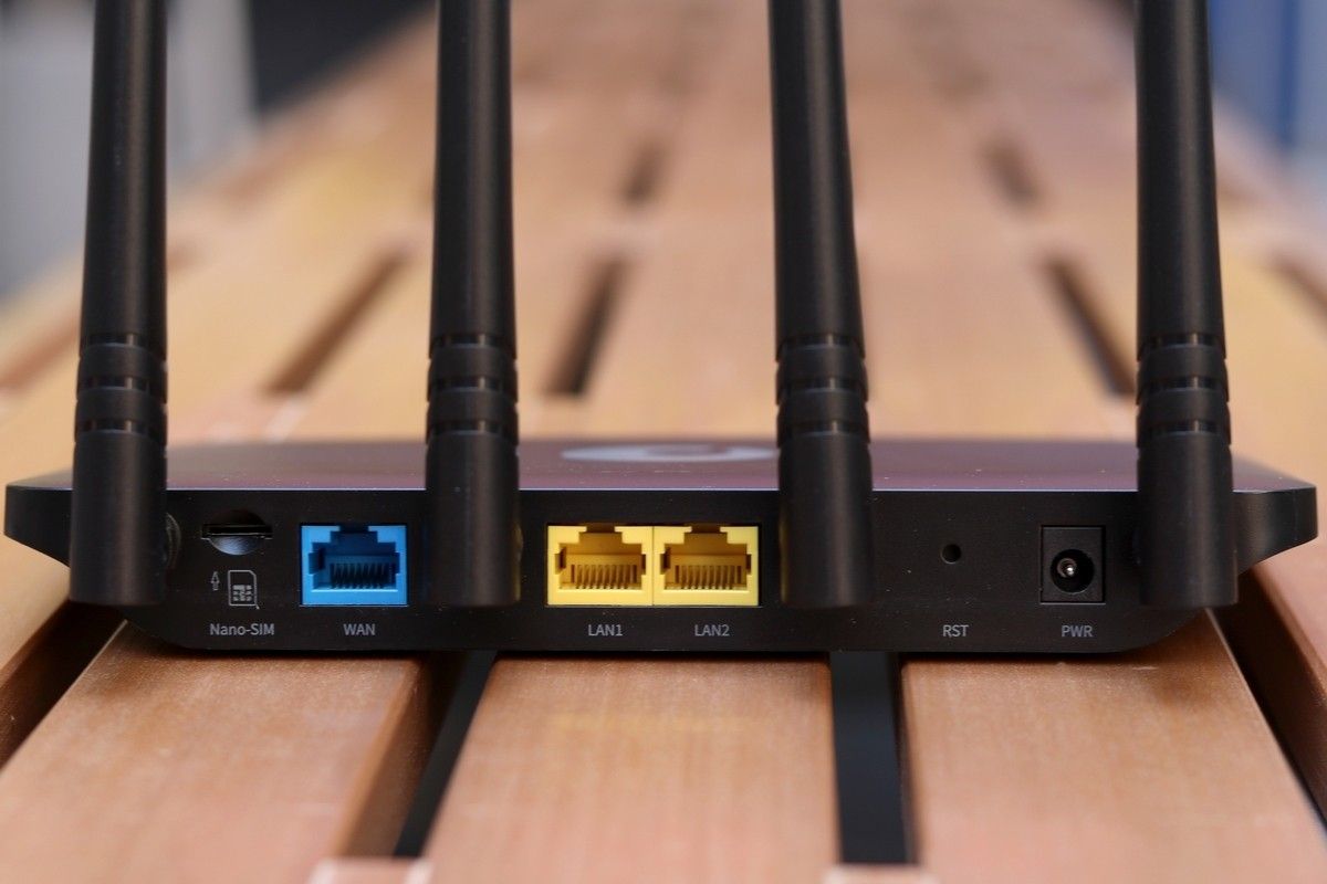 接线口均设计在背面,从左到右分别是sim卡插槽、1个WAN口、2个LAN口(百兆),还有RST重启键,电源接口。