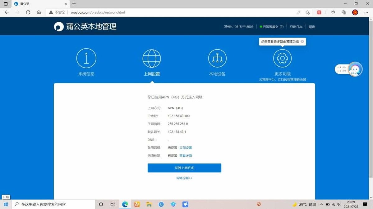 当时了,蒲公英4G路由器X4C更重要的功能就是4G上网功能,而且同时接入有线和4G的话,系统还会根据网络环境智能切换。例如有线断开之后,路由器会自动启用4G上网,不用担心断网的问题,比较适合对网络稳定性有比较高要求的场景下使用。另外,在不方便拉网线,或许暂时没有网线的使用场景下,蒲公英4G路由器X4C的4G上网功能就显得格外重要了。