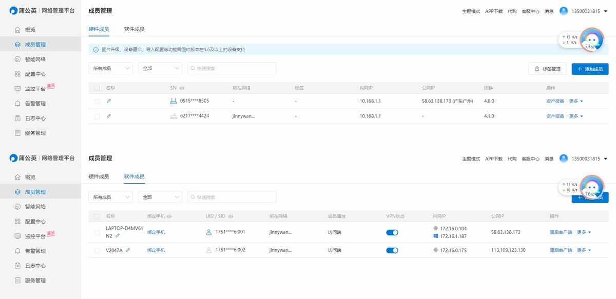 组网的方式其实很简单,就是添加成员,而且还有硬件成员和软件成员之分。硬件成员主要就是蒲公英路由器,只要输入背后的SN码就可以加入;软件成员主要是客户端,尤其是手机使用的。将成员都加入来,全部统一管理,就能轻松的实现更多共享操作。