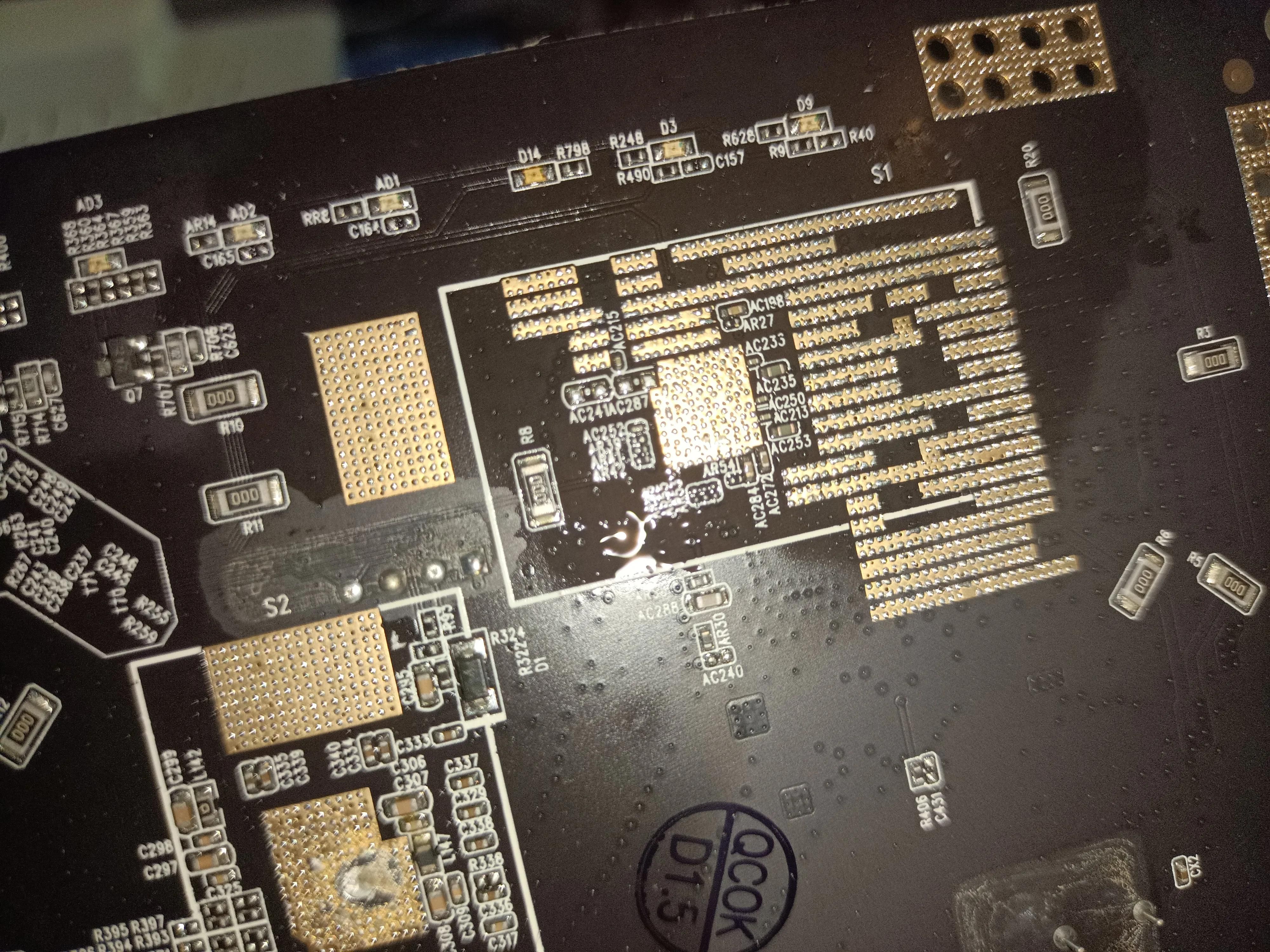 内部做工还是不错的,从左到右依次是闪存,两颗内存,RTL8197FB,中间和右边的芯片看不清楚,上面油乎乎的,看来确实是漏油了。