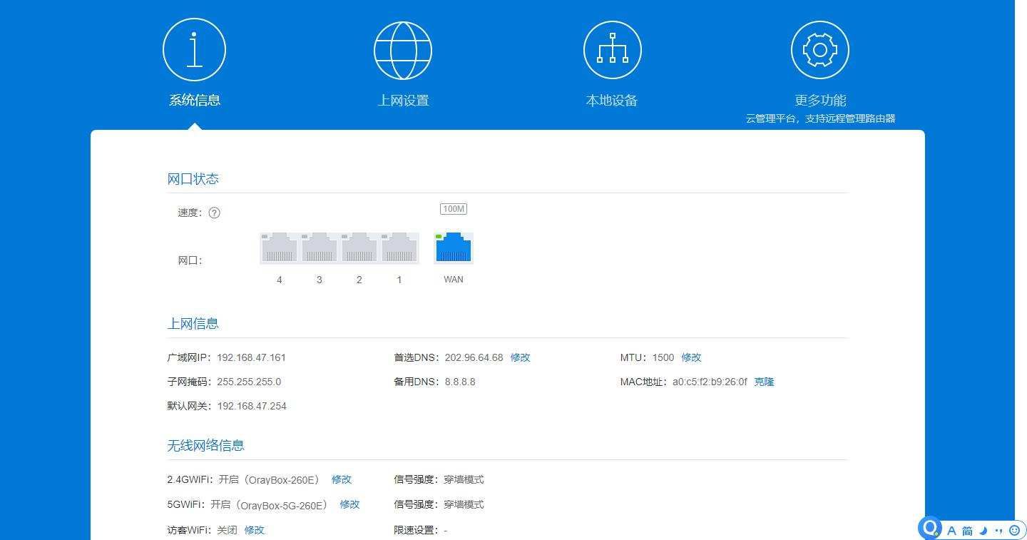 而系统信息界面,可以全面的了解路由器的方方面面,包括网络连接状态、智能组网、WiFi设置、接入设备等,都非常的直观。而本地设备则可以清楚明了的看到都有哪些设备接入到无线网络当中,并且可以对每一个设备进行网络管理、网速限制、WiFi模式设置等操作。