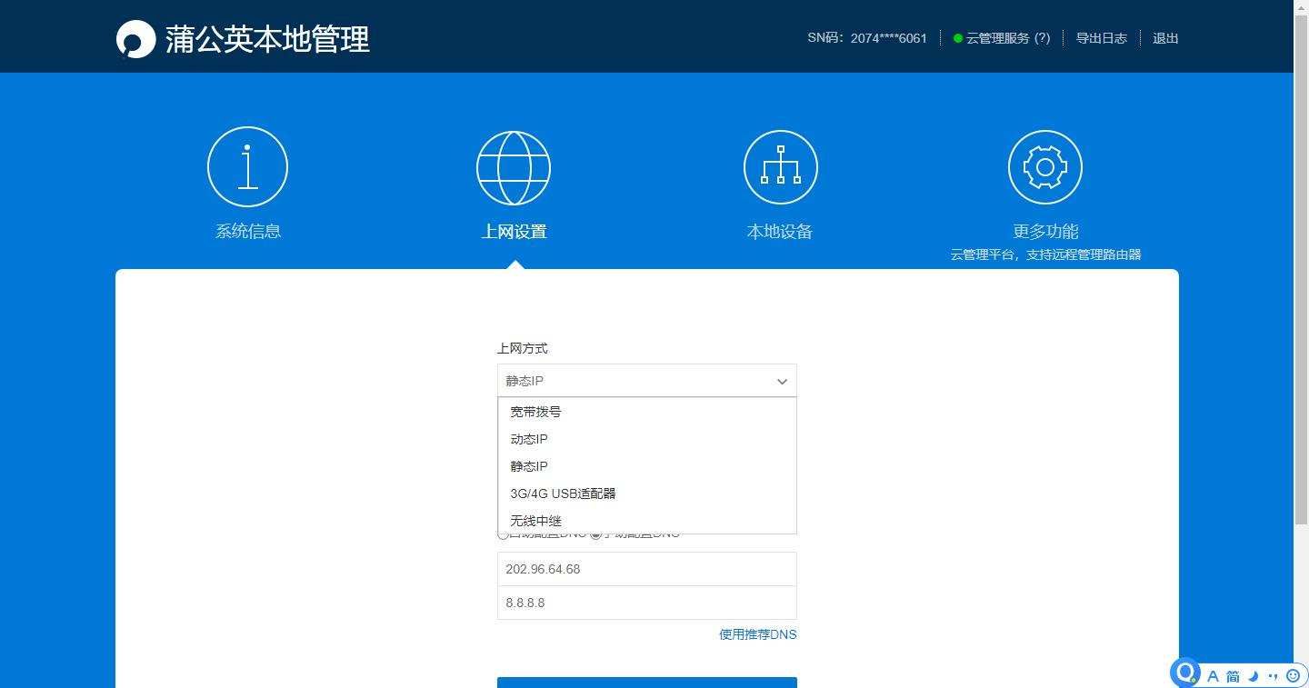 在介绍外蒲公英X5的外观后,下面我们就正式进入使用体验,在进入管理界面之后我们能够看到的是一些路由器的常规设置、包括系统信息、上网设置、本地设备以及更多功能。在上网设置里可以调整上网的方式包括:宽带拨号,静态IP,动态IP,3G/4GUSB适配器、无线中继等常见入网方式,设置上也非常的简洁明了,无论是不是初次接触网络的人都能够轻松的找到设置内容。