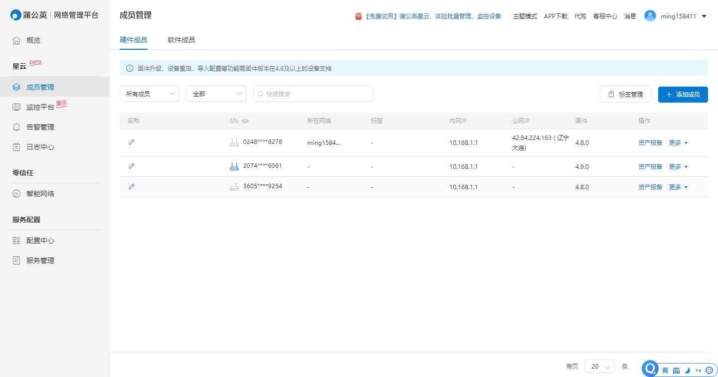 其中蒲公英系列最具特色的远程组网功能就包含在其中,而如果想与异地的蒲公英路由器进行组网的话,步骤也特别的简单。1、登录贝锐账户。2、点击我要组网。3、将设备添加到成员当中即可完成。整个过程根本不费力,能够轻松的就完成了网络远程组网,组网成功后就能够访问异地网络的内容。