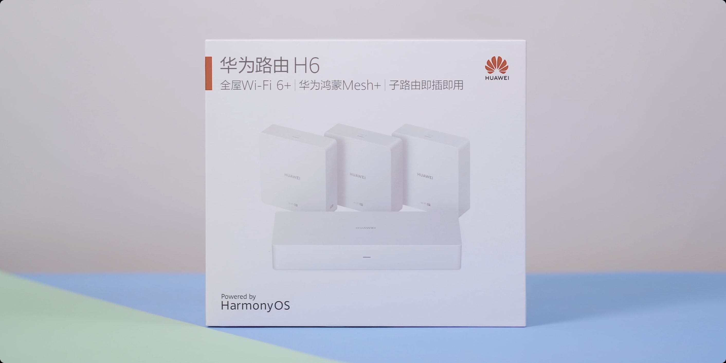 路由的外包装还是华为一贯的简洁风格,包装盒上标注有:全屋Wi-Fi 6+、华为鸿蒙Mesh+、以及子路由即插即用等关键的信息点,对了还有就是左下角的Powered by HarmonyOS标注,非常的显眼了!