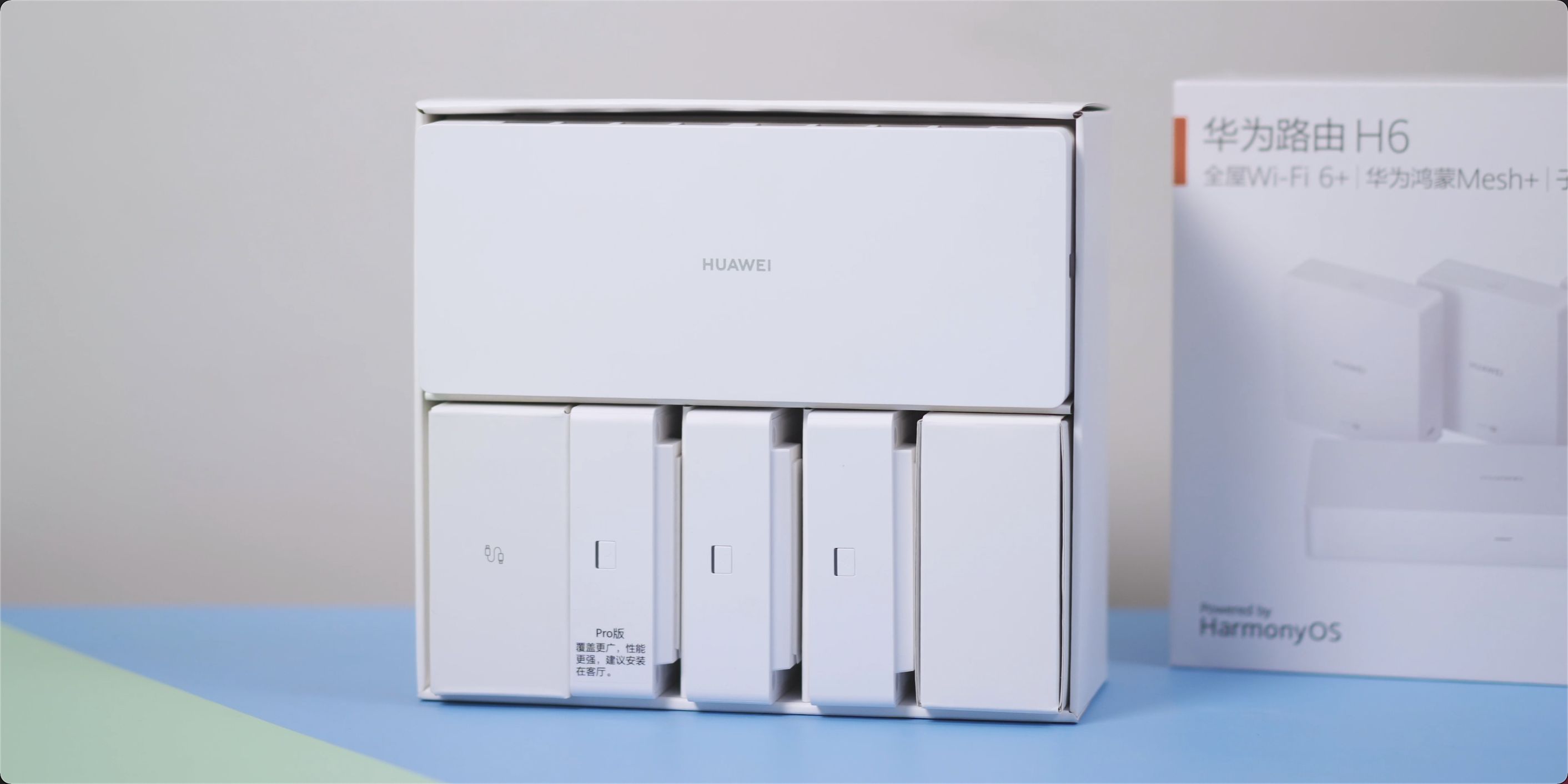 打开包装后可以看到,华为路由H6全套包含有一个母路由、一个子路由Pro、以及两个子路由,母路由可以放置在配电箱中,然后通过预制好的网口与各个子路由相连。需要注意的是,子路由Pro性能相对更强、覆盖更广,建议安装在客厅或者家里相对比较居中的位置。其他两个子路由可以根据室内的结构和户型的不同,分别放置在卧室或者书房等区域,以达到更好的覆盖效果!