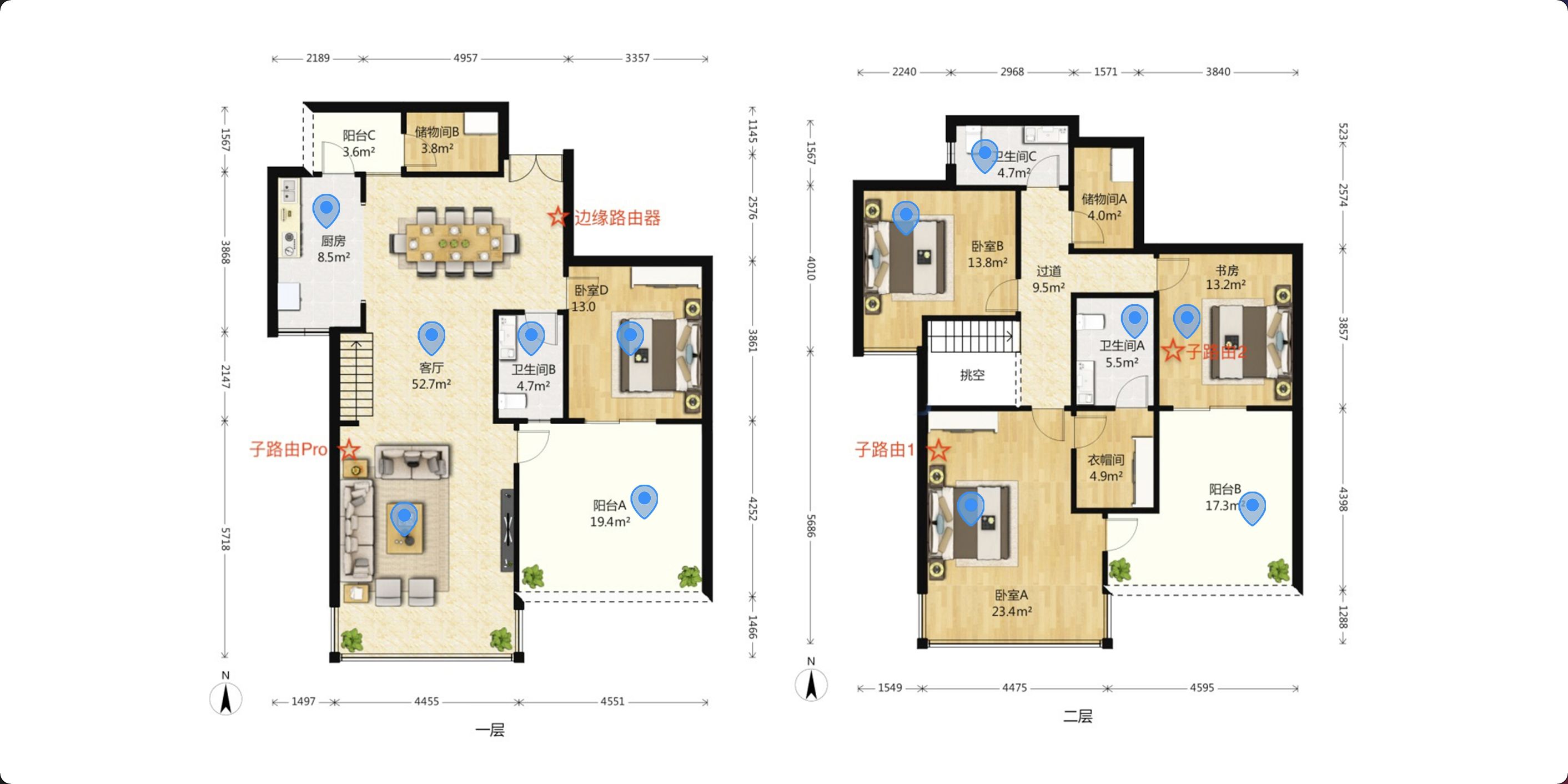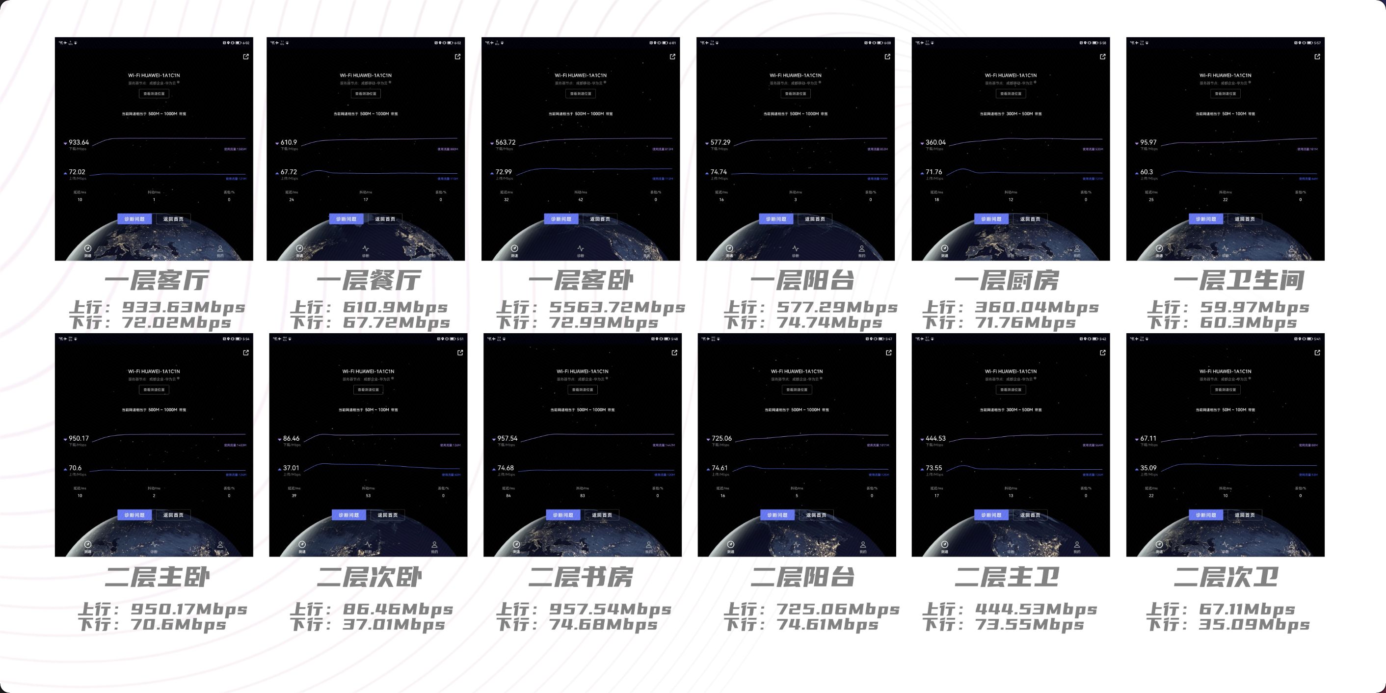从测试结果来看,无论是一楼还是二楼,几乎每个房间都实现了较为完整的覆盖,信号最弱的区域显示为二楼次卫,但基本也能稳定在-70dBm左右,整体从信号覆盖上来说,华为路由H6的表现还是非常不错的!