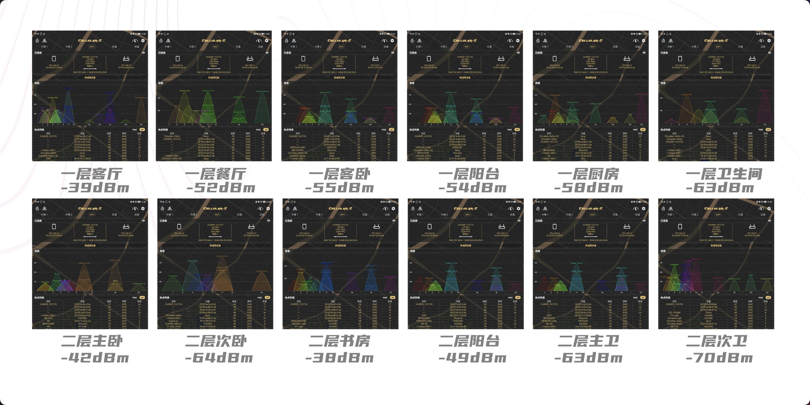 首先来看信号强度,我们分别对楼上楼下不同区域的不同房间进行了测试,随后将数据进行了统计和汇总。