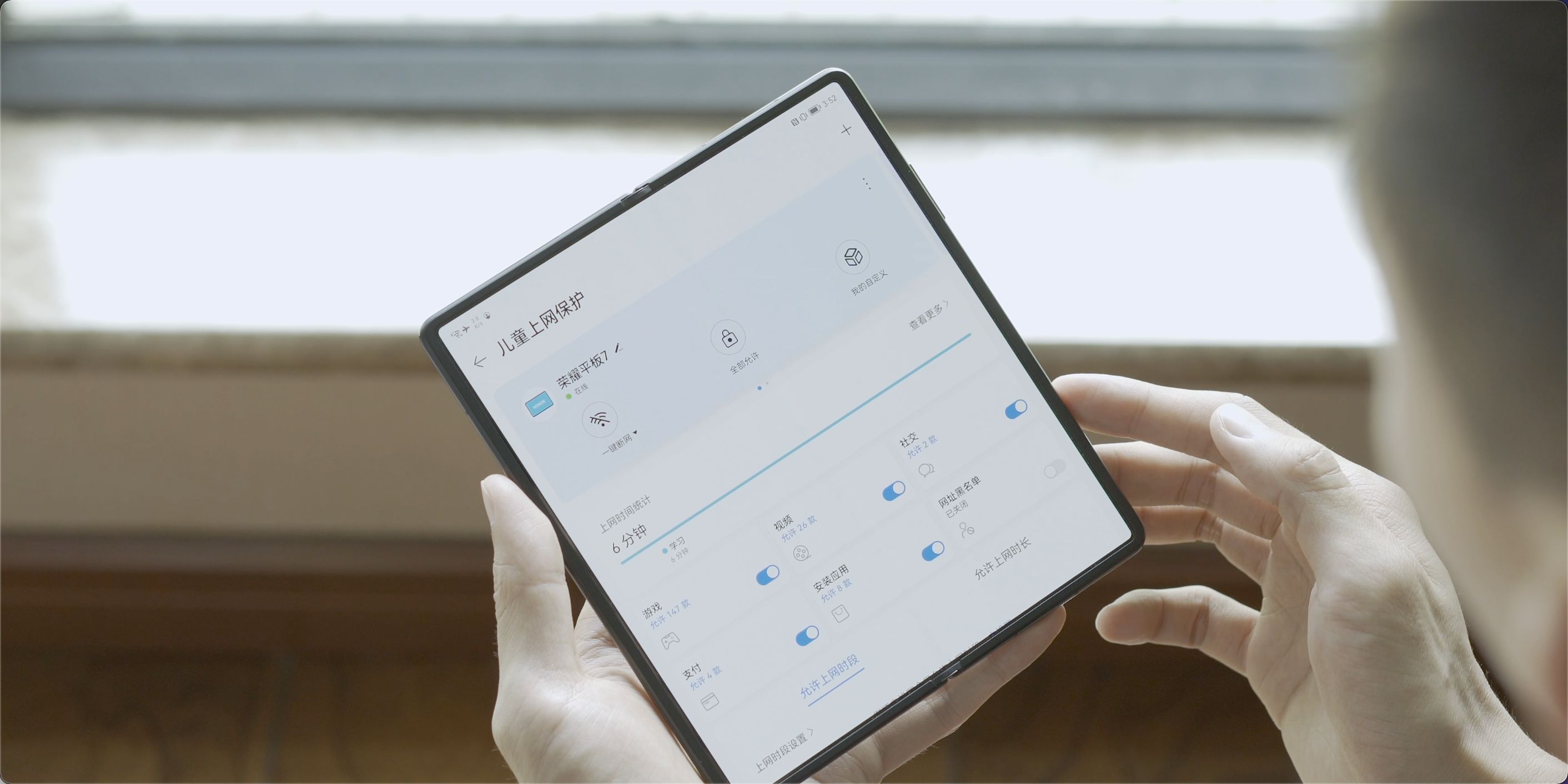 那对于成年人来说,游戏用来打发时间,那对于孩子来说,学习则是首要的任务,华为路由H6还专门针对儿童设定了一些专属的功能和控制权限,家长可以通过华为智慧生活APP,对儿童设备的上网时长、支付、游戏、视频、社交等操作进行限制,合理规划孩子的上网时间,尽可能降低孩子沉迷网络的可能性。