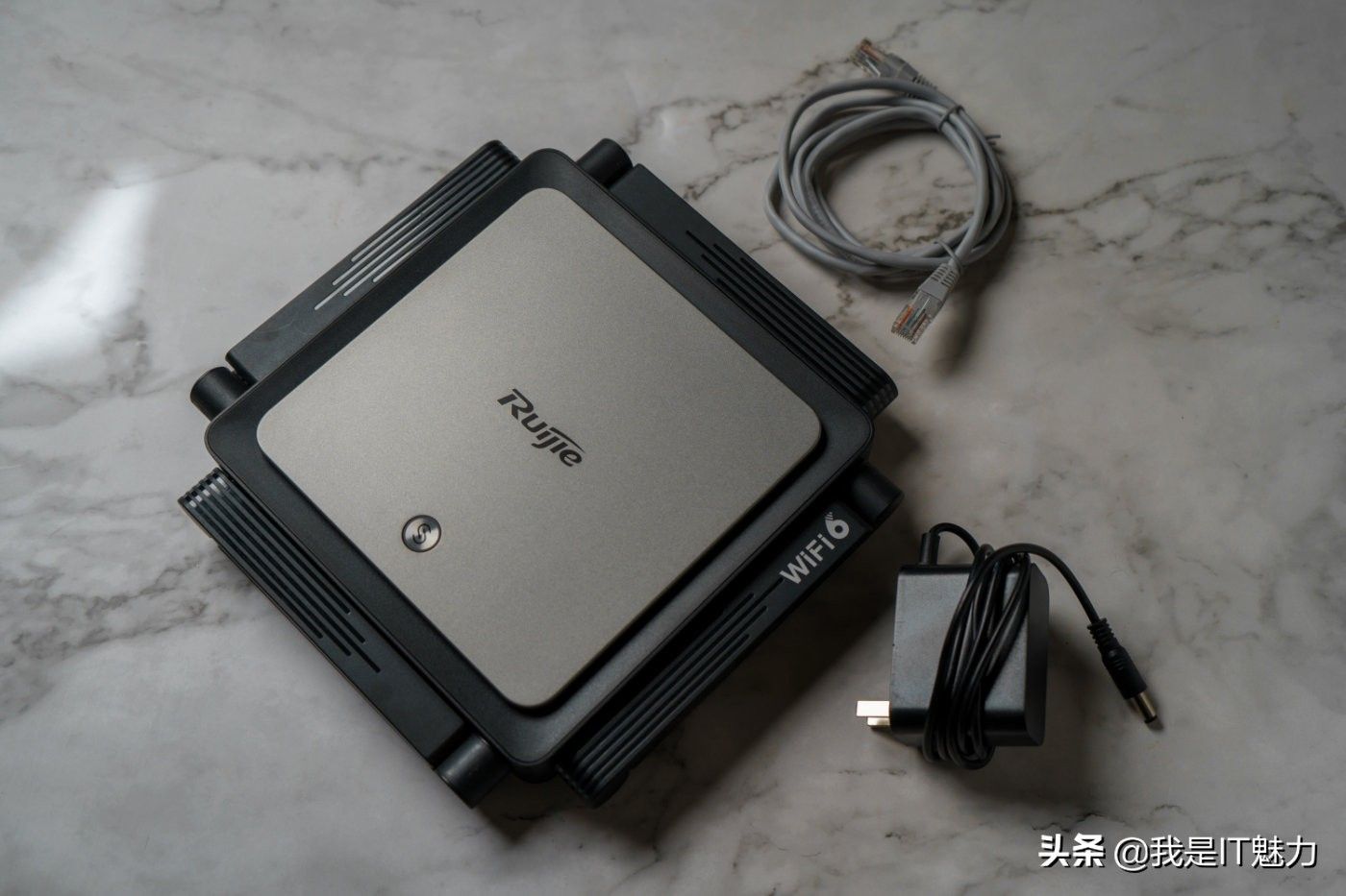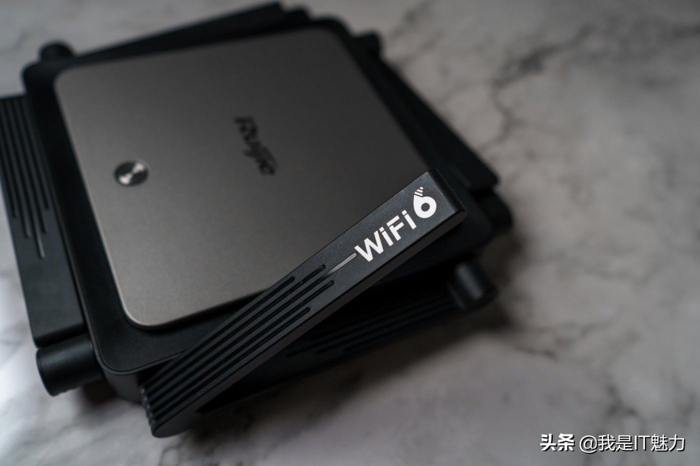 先看外观,锐捷星耀X32 PRO路由器采用了方正设计风格,灰色配色顶盖为磨砂设计,其它部分为黑色配色,黑灰配色拼接非常有质感,辨识度直接拉满。