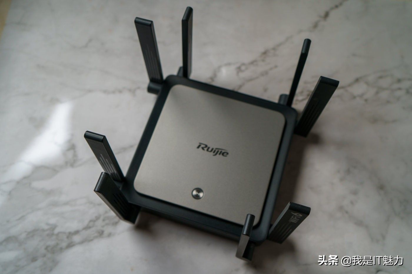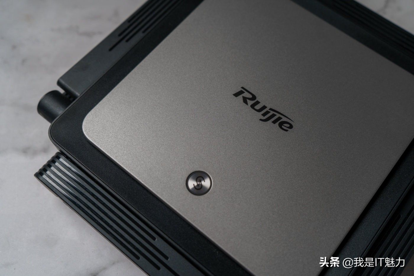 顶盖“Ruijie” logo下方有一个按钮,这是锐捷路由器的独家技术-易联,可以免配置一键组网,小白也能秒变大神,适合大户型或复式用户使用,通过多台路由器覆盖家里每一个角落。