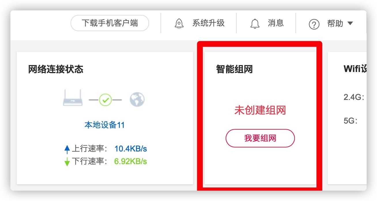 然后进入路由器管理后台,绑定Oray账号和创建智能组网,首页上红色提示的框框就是智能组网的设置项。