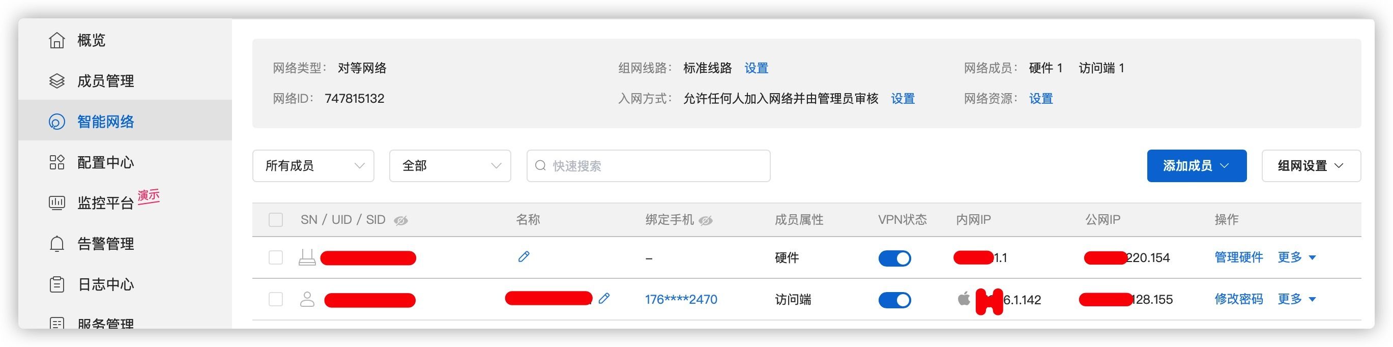 智能组网需要绑定Oray账号,并且建立或加入已有组网,将成员加入在内,目前免费的设备只允许3人建立免费组网,另1个人可共用一个人的账号。有刚需的同学也可以选择购买成员数量增额。