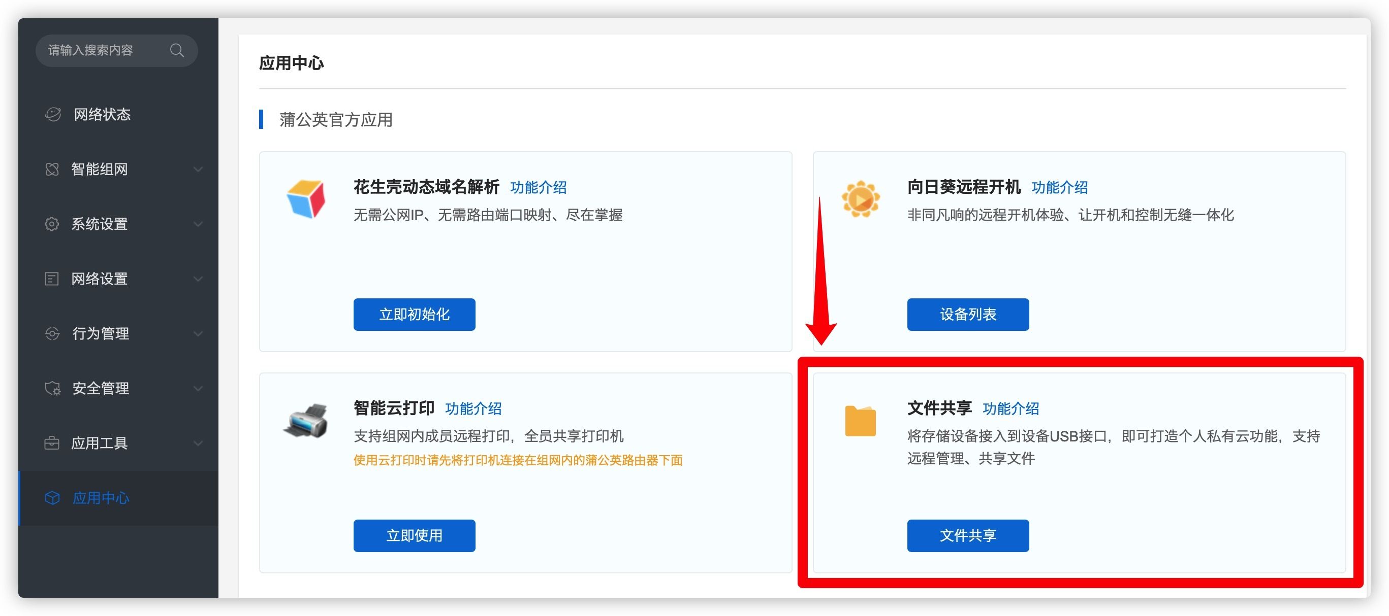 选择应用中心中的文件共享功能,进入之前需要确保移动硬盘已经插到的USB接口上。