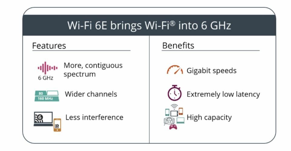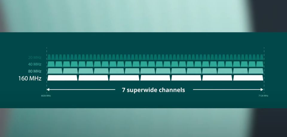 Wi-Fi 6E新增了对6GHz频段的支持,此前的Wi-Fi标准仅支持2.4GHz和5GHz。从5GHz到6GHz,它的无线电波数量增加了4倍,共增加了14个额外的80MHz频道,以及7个额外的160MHz 频道,这意味着能实现更少的信号干扰,Wi-Fi的稳定性会大幅提高。