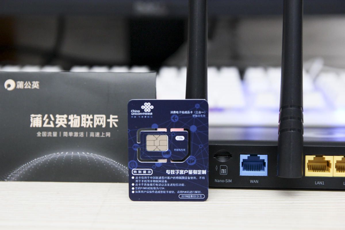 包装里除了路由主机,还有电源适配器和附赠的一张中国联通4G SIM卡。这是由蒲公英定制的物联卡,只能用于蒲公英路由器使用,更换其它设备会锁卡。不过蒲公英X4C路由器并不限制使用第三方的4G SIM卡,用户可以更换成自备的4G流量卡。