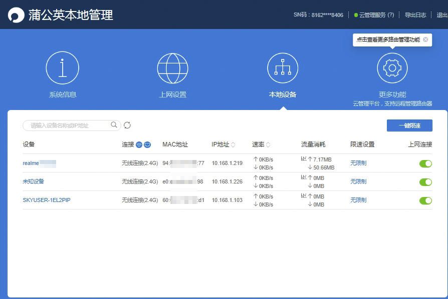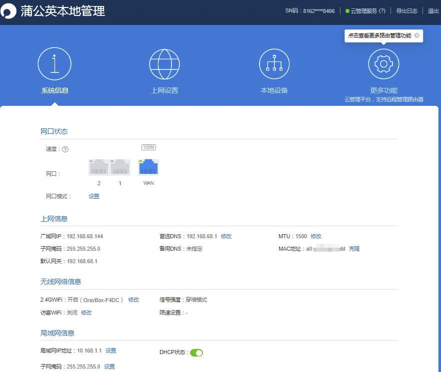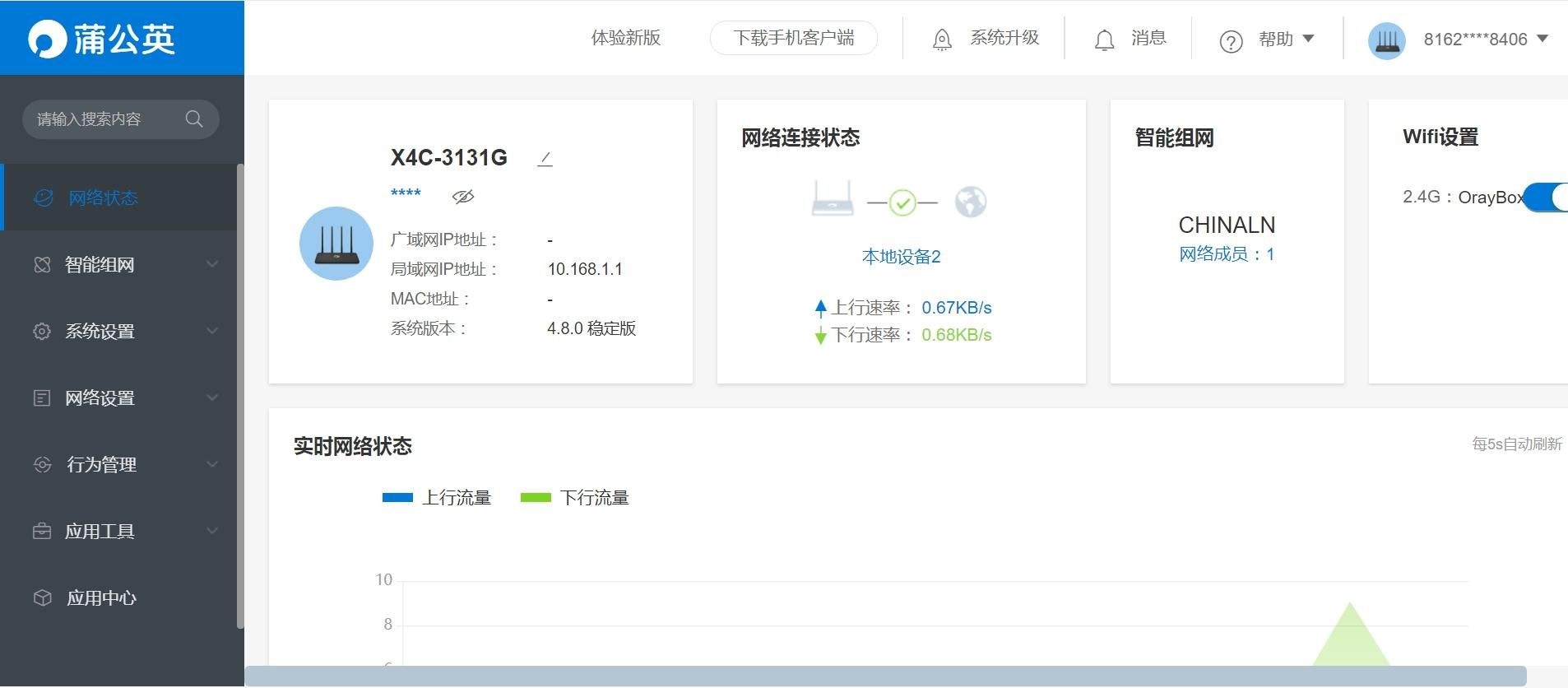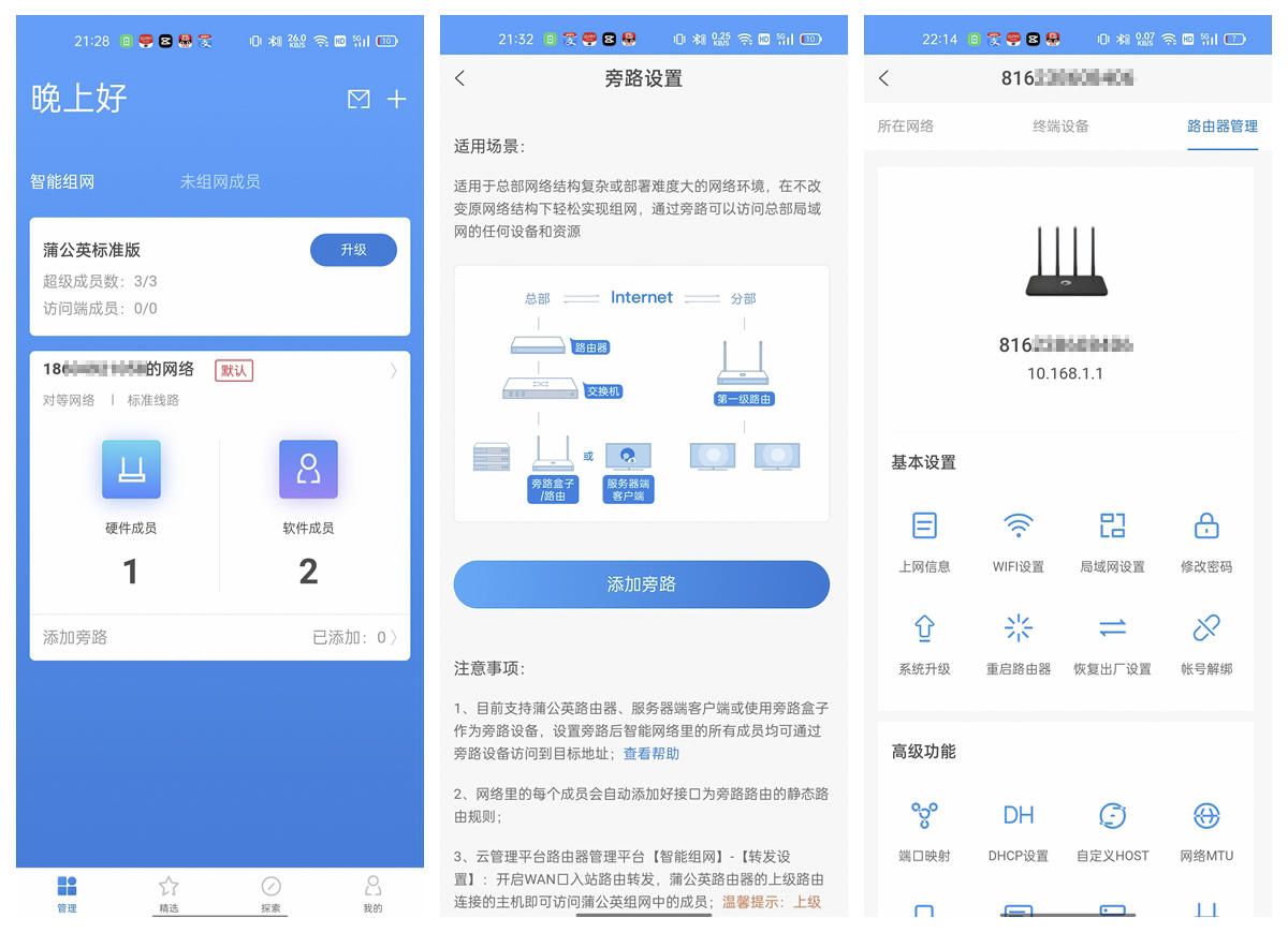 为了方便管理,手机端需要安装“蒲公英管理”APP,使用已绑定路由器的Oray帐号登录即可。这款软件可实现对软、硬件成员分别进行管理,也可以对路由器进行高级管理,比如进行WiFi设置、局域网设置、修改密码等操作,还可以完成端口映射、DHCP设置、自定义HOST、网络MTU、智能QOS等等功能设置,满足网络建设的更多专业需求。