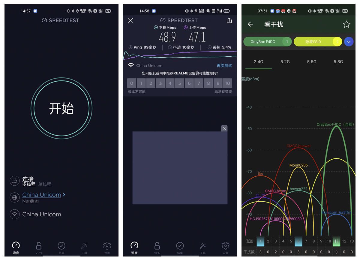 关于网速还是有必要测试的,下图是安卓手机通过2.4GHz WiFi连接路由器的测速图,使用的软件是SPEEDTEST,距离路由器5米左右。连接2.4GHz下载最高达到48Mbps,上传为47Mbps,ping值为89毫秒,抖动10毫秒,丢包在5.4%。数据综合来看还是不错的,毕竟是4G网络转换为WiFi使用,网速取决于当地运营商网络信号,网络监控摄像头连接网线会获得更低的时延和更少的丢包。