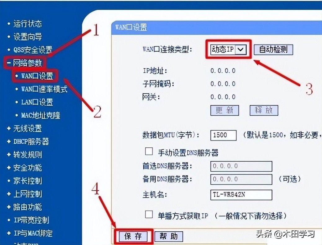 2、在路由器2的设置界面,点击“网络参数”——>“WAN口设置”——>“WAN口连接类型”选择:动态IP(有的路由器上叫做“自动获取”、“DHCP”)——>点击“保存”。
