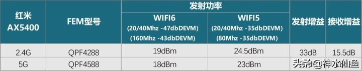 5G频段使用4颗QPF 4588FEM芯片,2.4G采用2颗4288芯片,FEM芯片的详细放大能力见下表: