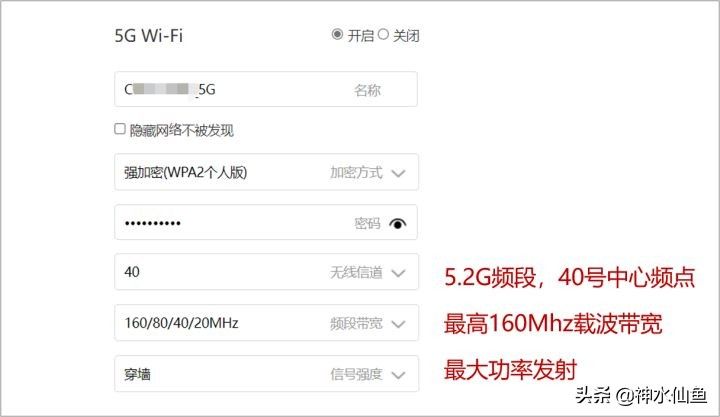 测试时,5G频段使用5.2Ghz的40号信道作为中心频点,开启160Mhz载波带宽。