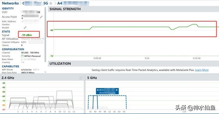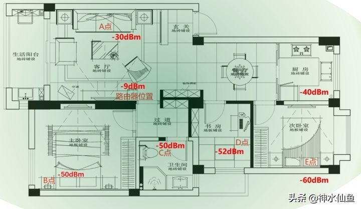 在距离路由器位置最远,且隔了2堵墙2个衣柜的E点,仍然能稳定在-60dBm: