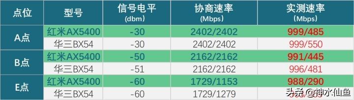 - 测试方法:房子内固定5个常用点测试,记录平均电平、速率和时延;