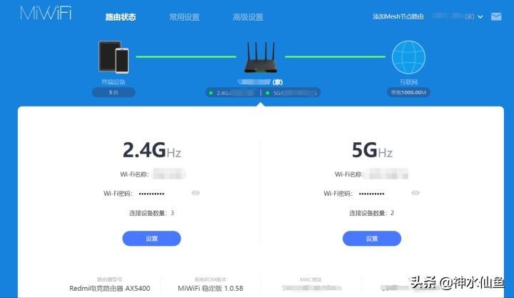 红米AX5400目前使用的固件版本是1.0.58版,固件界面和逻辑与小米路由器一致,因此也能与小米路由器一起组MESH;