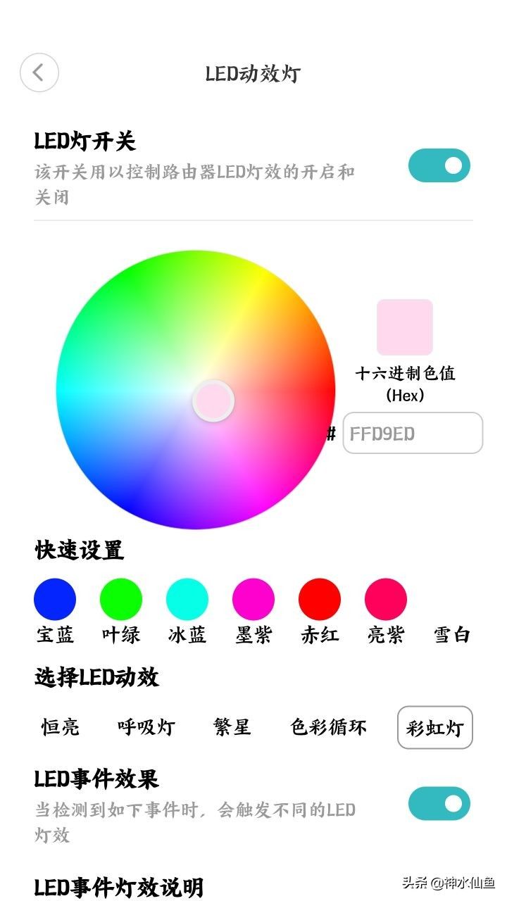 AX5400的状态指示灯和RGB灯带的开关都在米家APP上,支持多种灯效: