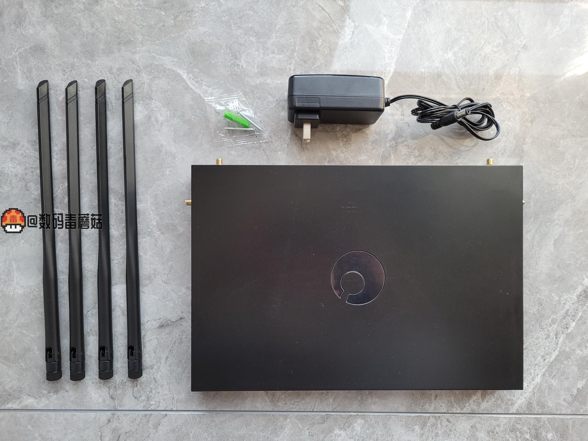 抛开说明书不计,主要附件有四根7dbi可拆卸天线、一个电源、几条挂墙螺栓以及路由器本体(补充一下还有四个脚垫,在盒子底部我一开始没看到)。